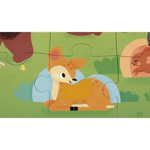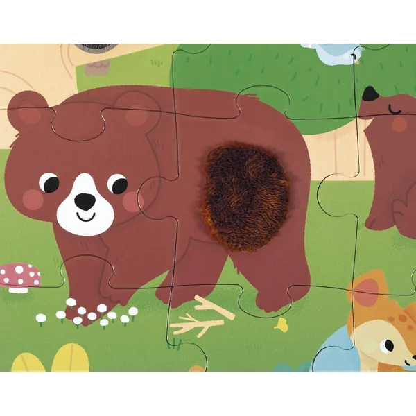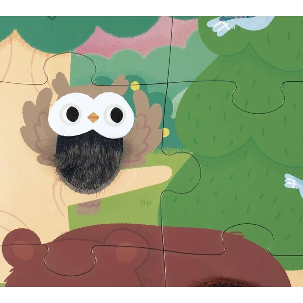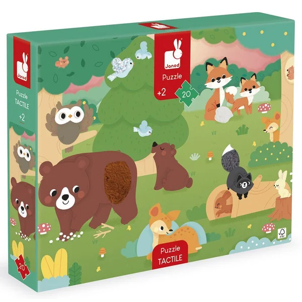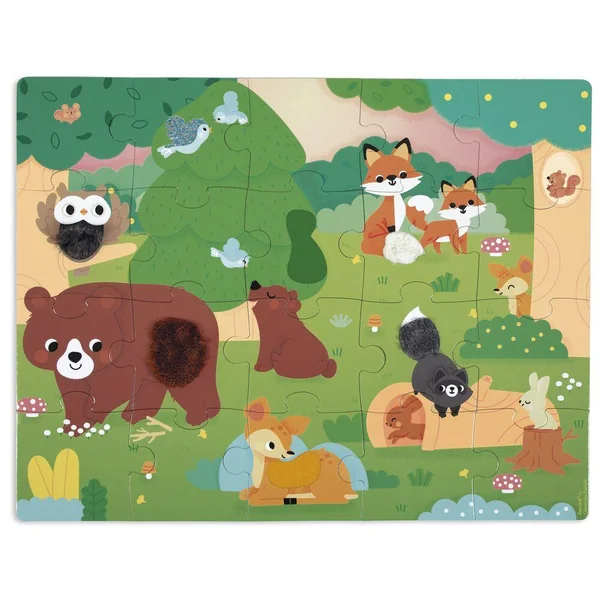 Qui se cache dans les bois ? Partez à la rencontre des animaux de la forêt avec ce puzzle tactile géant ! A l’aide du poster inclus, l’enfant pourra assembler ce joli puzzle composé de 20 pièces, dont 7 sont texturées. Il découvrira les différentes matières/textures sur le puzzle, ce qui favorisera le développement du toucher et de la motricité fine. Puzzle en carton FSCTM, pour les enfants à partir de 2 ans.