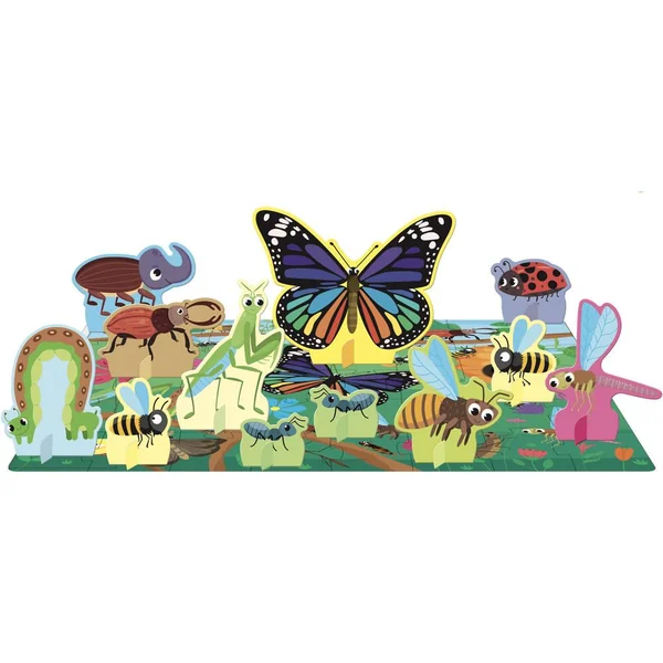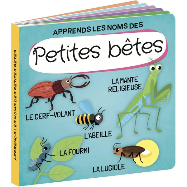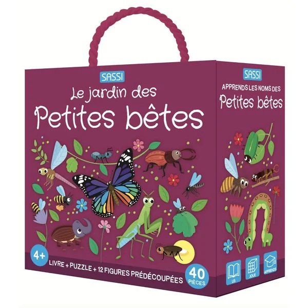 Une boîte avec des détails irisés qui contient un livre de dix pages, un puzzle de 40 pièces et 12 formes à assembler pour apprendre à reconnaître et à associer les éléments et les mots.