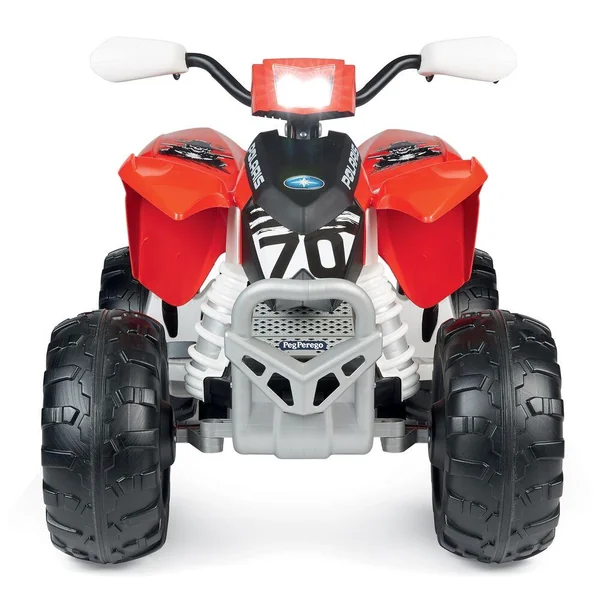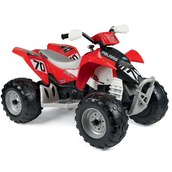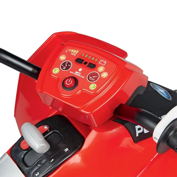 Polaris Outlaw 330W est toujours prêt pour de nouvelles aventures. Et quelles aventures ! Qualité italienne et caractéristiques performantes, tels que les lumières, les sons, les mélodies et le klaxon pour s’amuser dès 3 ans. Le quad électrique PEG fonctionne avec une lithium batterie rechargeable de 12 V 8 Ah. Allume le tableau de bord électronique avec le bouton START ou appuie sur la pédale d’accélérateur et tu n’en croiras pas tes yeux ! En plus de la lumière du phare à LED avant, tu entendras le vrombissement du moteur, et tu pourras klaxonner et entendre des mélodies pré-enregistrées. Pour écouter ta musique préférée, utilise la prise pour brancher ton lecteur MP3 (non inclus). Une série de LEDs indique l’état de charge de la batterie pour que le temps de jeu reste toujours sous contrôle. De plus, l’arrêt automatique permet d’économiser la batterie, il se déclenche au bout de 3 minutes de pause. Le levier de vitesse permet de choisir entre deux vitesses d’environ 4 ou 7 km/h et une marche arrière. La vitesse la plus élevée peut être bloquée jusqu’à ce que l’enfant se familiarise avec la conduite. La traction extrême et les roues surélevées à crampons permettent de voyager hors route en toute sécurité, même sur les chemins de terre et les sols accidentés, pour des aventures sans limites ! Grâce à la force des doubles roues motrices, le tout-terrain gravit des pentes de 10 %. Poids maximum transportable : 40 kg. Rien à envier à un vrai quad ! Pare-chocs, garde-boue, repose-pieds et grand confort de conduite grâce au siège spacieux et aux poignées antidérapantes. Le véhicule fonctionne avec une batterie lithium rechargeable 12V 8Ah. La batterie peut être rechargée à l’aide d’une prise de courant ordinaire, directement dans le véhicule ou en l’extrayant. Chargeur et batterie inclus. Pour activer la batterie à sa capacité maximale, il est important de la charger la première fois pendant au moins 18 heures et pas plus de 24 heures.