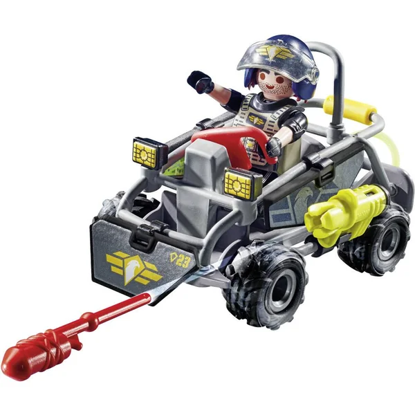 Avec un personnage. Les roues du quad sont amovibles et les flotteurs peuvent être installés sous la structure du véhicule pour flotter sur l’eau. Le visage du personnage peut être tourné pour passer du méchant au gentil.