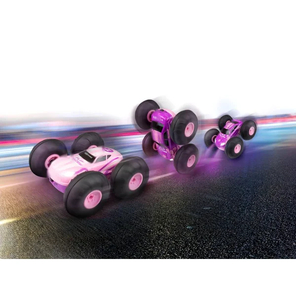 Voiture de stunt RC à 2 canaux avec télécommande 2,4 GHz. Puissante traction intégrale. Avec fonction flip à 180° et spin à 360°. 2side Function – peut être conduit des deux côtés. Avec un éclairage LED du plus bel effet. Feuille d’autocollants à coller soi-même incluse. Longueur du modèle : 155 mm. Fonctionne à piles (1 pile 9V et 4 piles LR03 AAA non fournies. À partir de 6 ans.