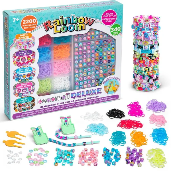 Le kit Rainbow Loom Beadmoji Deluxe comporte des perles et des élastiques résistants pour fabriquer de nombreux bracelets entièrement personnalisables en taille et en couleurs ! Les bracelets peuvent être customisés avec les Beadmoji contenus dans ce kit. Ce sont des perles avec des messages, des icônes, pour rendre chaque bracelet absolument unique. Encore mieux pour les créer et se les offrir entre amis !