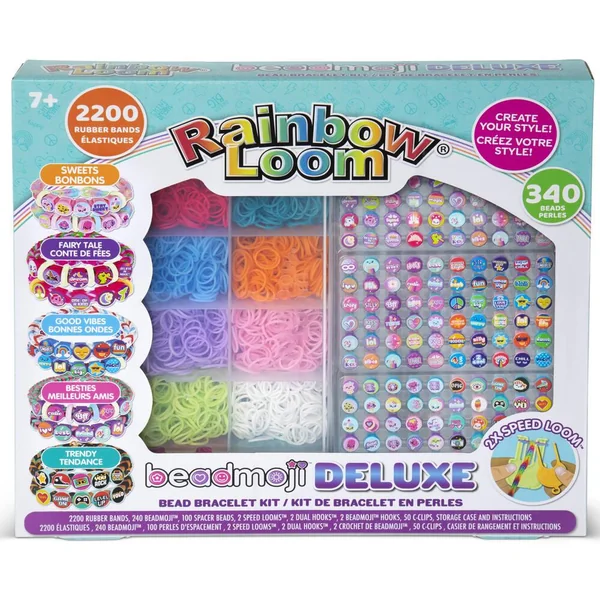 Ce kit de fabrication de bracelets comprend : 2200 élastiques sans latex, 240 Beadmoji, 2 crochets Beadmoji, 100 perles de séparation, 2 métiers à tisser Speed Loom, 2 crochets doubles, 50 C-Clips, une Boîte de rangement, un manuel d’instructions étape par étape.