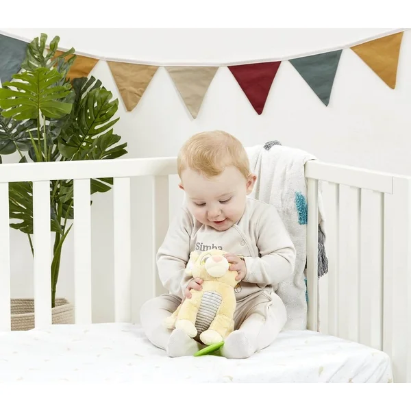 Le lionceau a un ventre texturé et des oreilles douces bordées. Il a un anneau de dentition attaché à sa patte, qui aide à apaiser les gencives douloureuses de l’enfant. Les différentes rubans en tissu, qui se trouvent sur sa queue et sa patte, encouragent le jeu sensoriel.