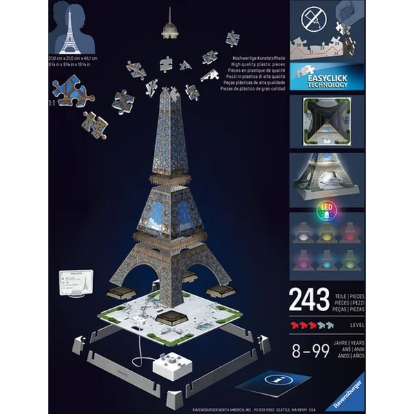 Ravensburger Iconics : Tour Eiffel (Édition Nocturne) est un puzzle 3D unique de 216 pièces qui s’emboîtent parfaitement grâce à la technologie EasyClick – sans colle et sans désordre.