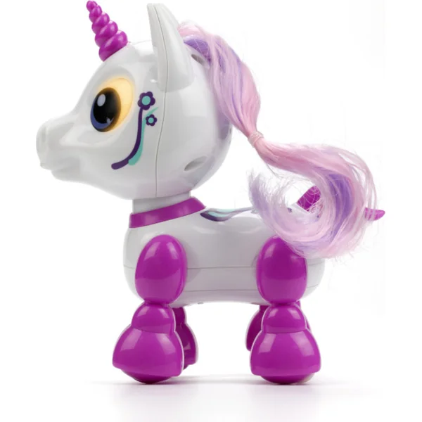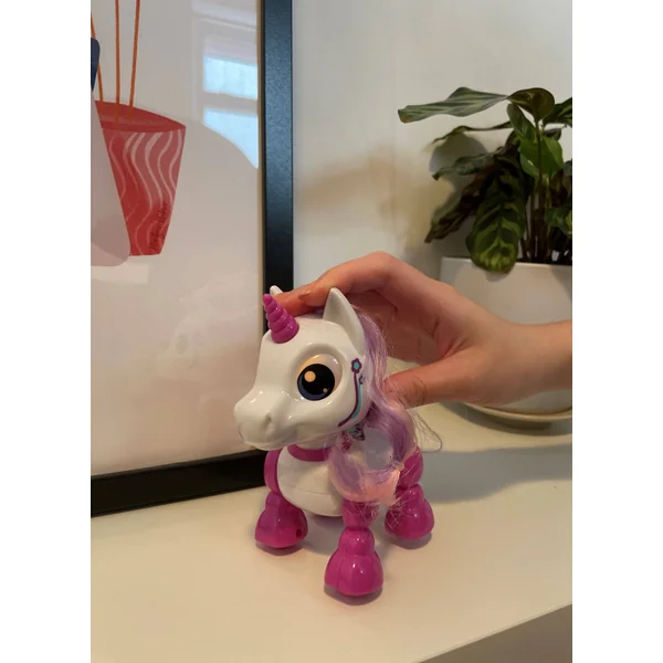 Le contrôle est simple et amusant. Si tu appuies sur la tête de la licorne, elle avancera, mais si tu lèves la tête, la licorne reculera. L’adorable licorne blanche et rose a de jolis yeux qui brillent et émet des sons adorables en se déplaçant. Sa crinière est composée de doux cheveux roses qui peuvent être peignés. Elle s’adapte parfaitement aux petites mains d’enfants et est recommandée pour les enfants à partir de 3 ans.
