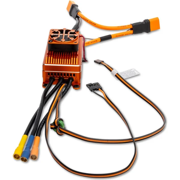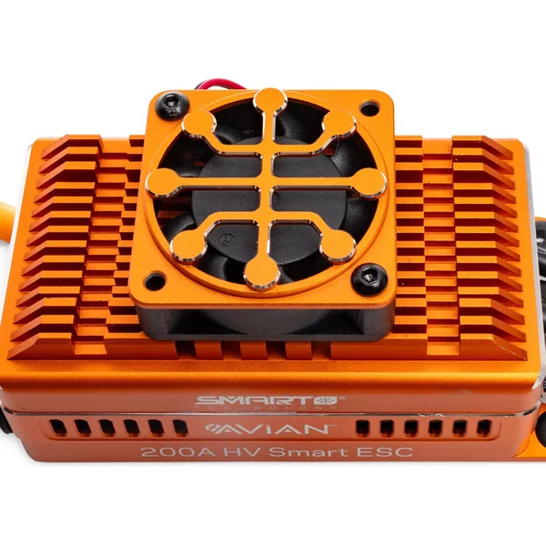 Le régulateur Avian 200A est dans un boîtier en plastique avec des pattes, vous pouvez soit le visser dans le modèle, soit le coller avec du ruban adhésif double face. Sur le dessus se trouve un dissipateur thermique en aluminium avec un ventilateur.