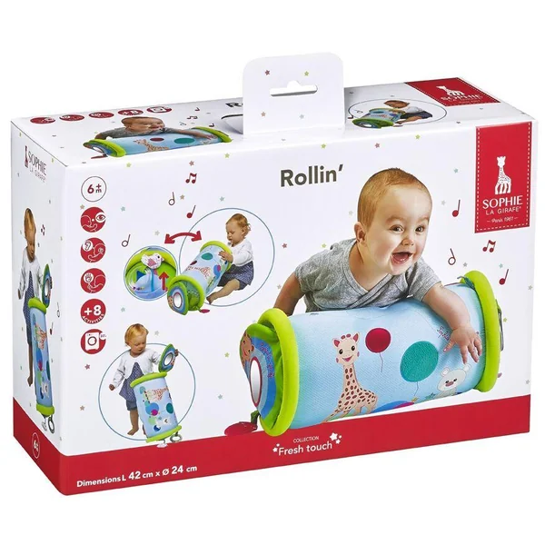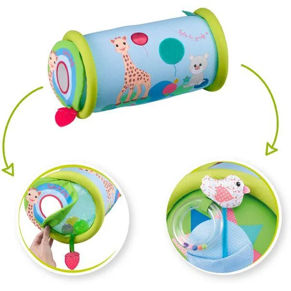 Un rouleau à escalader, à faire rouler et à chevaucher. Sa structure gonflable recouverte de tissu apporte confort, douceur et sécurité. Plusieurs activités à découvrir, pour développer les 5 sens de bébé : un miroir et des contrastes noir/blanc pour stimuler la vue; des balles sonores à l’intérieur du rouleau à faire rebondir, du papier froissé intégré dans la housse, un bruiteur caché dans Kiwi l’oiseau, pour stimuler l’ouïe; un anneau texturé à mordiller, pour soulager les poussées dentaires; des textures et matières variées et un filet à soulever afin d’éveiller la curiosité de bébé. Très léger et rapide à gonfler, le Rollin’Sophie se transporte facilement. Pratique ! La housse est amovible et lavable.