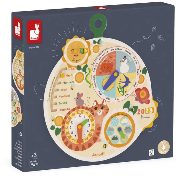 TIC…TAC, le temps est une notion difficile à apprendre. Grâce à ce jouet, votre enfant va apprendre à se repérer dans le temps tout seul et à son rythme. Un soleil tourne pour indiquer la date, un curseur permet d’apprendre les jours de la semaine, une horloge avec 2 aiguilles de couleur permet de différencier les heures et les minutes, un cadran météo pour que votre enfant apprenne à s’habiller seul, et enfin un cadran pour comprendre les saisons et les mois. Cette roue du temps comporte également une petite roue pour faire défiler les années (valable 10 ans, 5 ans sur une face, 5 ans sur l’autre). La roue peut être accrochée au mur. Jouet d’éveil en bois pour les enfants – Jouet en bois FSC™.
