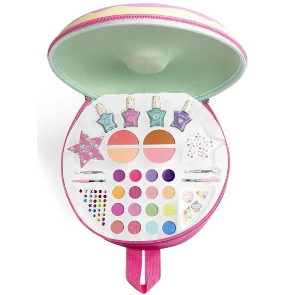 En forme de beignet et plein de surprises, ce set de la collection Yummy comprend 4 vernis à ongles, 4 fards à joues, 4 gloss, 12 fards à paupières, des gemmes pour les ongles, des autocollants, une lime à ongles et des tatouages. Parfait pour emporter du plaisir et du glamour partout où vous allez, ce sac à dos est idéal pour créer des looks pleins de couleurs et de saveurs.