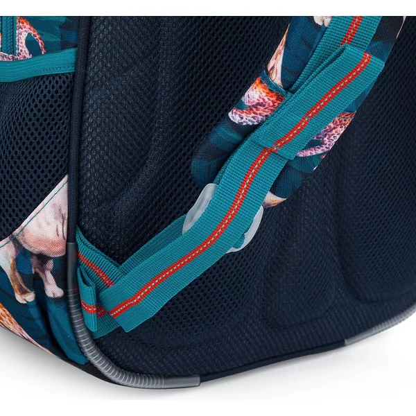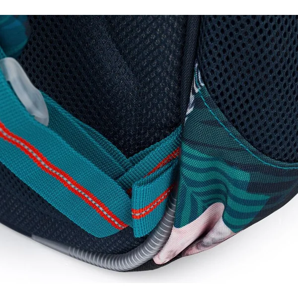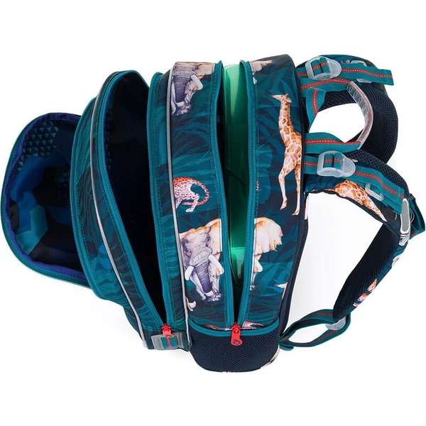 Le sac a deux compartiments principaux spacieux. Le compartiment arrière est plus spacieux et peut contenir tous les manuels scolaires de manière fiable. Le compartiment avant est un peu plus étroit et contient une petite poche en filet zippée et une étiquette.