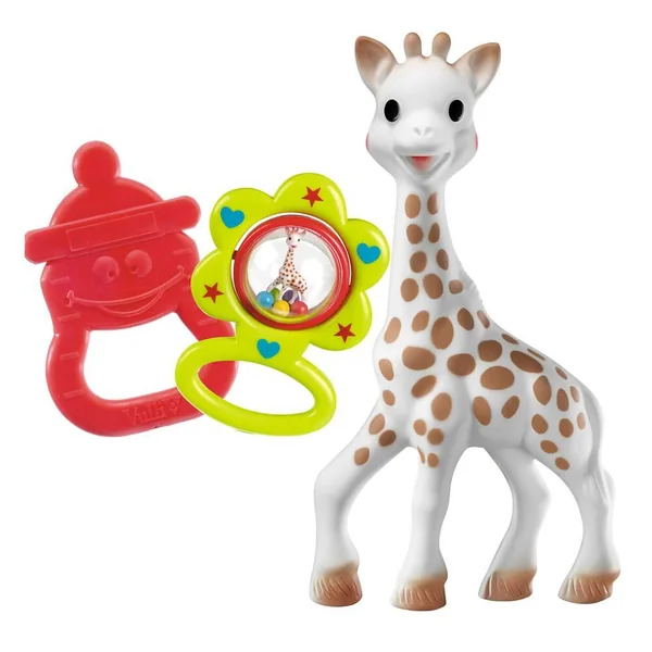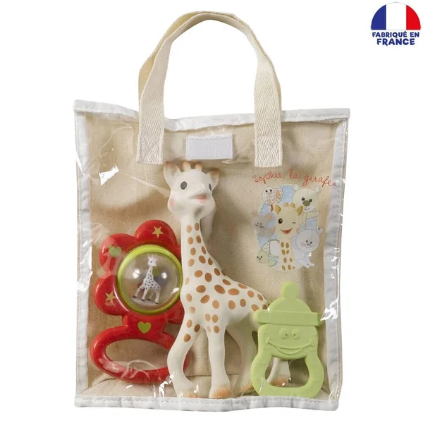 Idéal pour souhaiter la bienvenue à bébé ! Un petit sac à l’effigie de Sophie la girafe contenant l’indispensable pour éveiller les sens de bébé : Sophie la girafe, un hochet en forme de fleur à agiter et un anneau de dentition vanille à mordiller. Pratique, le sac fera le bonheur de bébé pour transporter ses jouets favoris.