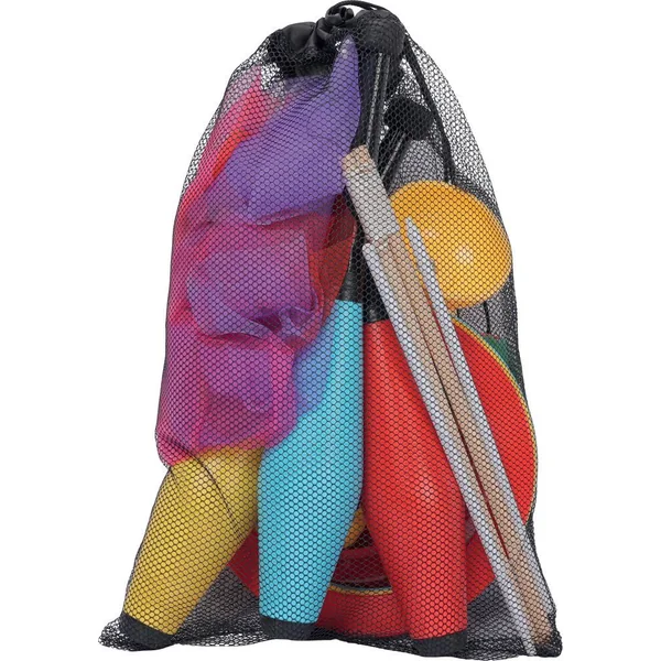 Sac de jongleur comprenant : 1 assiette chinoise de 23 cm avec baguette en 2 parties, 3 massues de jonglage de 42 cm, 3 anneaux de jonglage de 24 cm, 3 balles à grains de 6 cm, 1 diabolo 9.8 x 11 cm (avec 2 baguettes de 37 cm) et 3 foulards de 60 x 60 cm. Ensemble d’articles de jonglerie pour apprendre et se perfectionner. Il permet de pratiquer 6 activités de jonglage différentes que le jongleur emporte facilement avec lui grâce à son sac de transport pratique. Livré dans un filet pour le rangement et le transport, dimensions L. 31 x h. 46 cm.