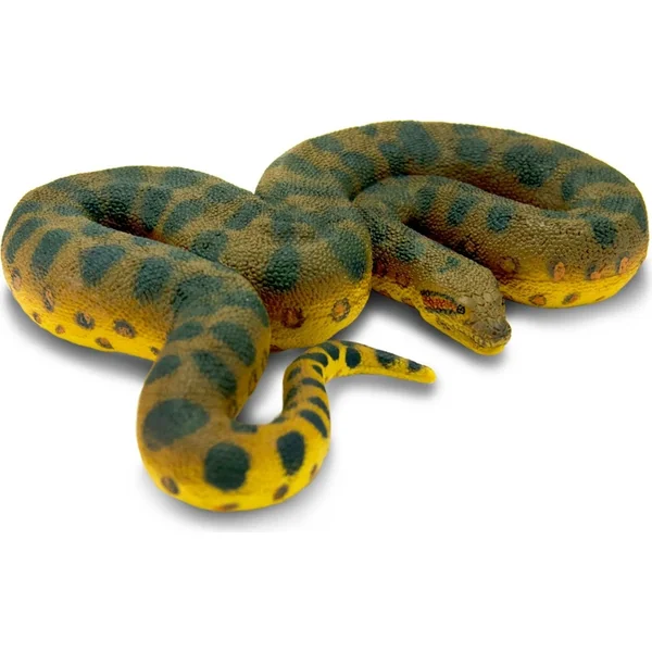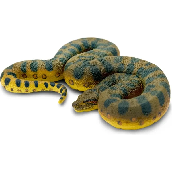 Le nom scientifique est Eunectes murinus. Cette figurine d’anaconda se distingue par un modelage scientifiquement précis et finement détaillé, qui capture le volume de ce serpent au corps lourd. Le serpent peint artistiquement est d’un vert olive terne sur le dessus avec des taches plus sombres, des points orange le long des flancs, un ventre jaune et une bande orange-rouge derrière chaque œil, qui distingue ce serpent des autres.