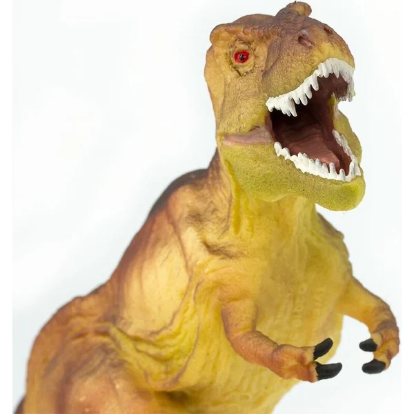 Caractéristiques : Le Tyrannosaurus rex était un dinosaure grand (au moins 40 pieds, environ 12 m), massivement construit (5 à 6 tonnes métriques), et bipède. Comme le montre notre jouet Tyrannosaurus rex, sa tête était énorme et ses mâchoires contenaient de nombreuses dents acérées, dont certaines mesuraient au moins six pouces (environ 15 cm) ! Chaque dent avait des dentelures sur le bord avant et arrière, fonctionnant comme un couteau à steak, qui coupait facilement la chair de sa proie. Le Tyrannosaurus rex pouvait chasser et manger n’importe quel dinosaure qu’il voulait.