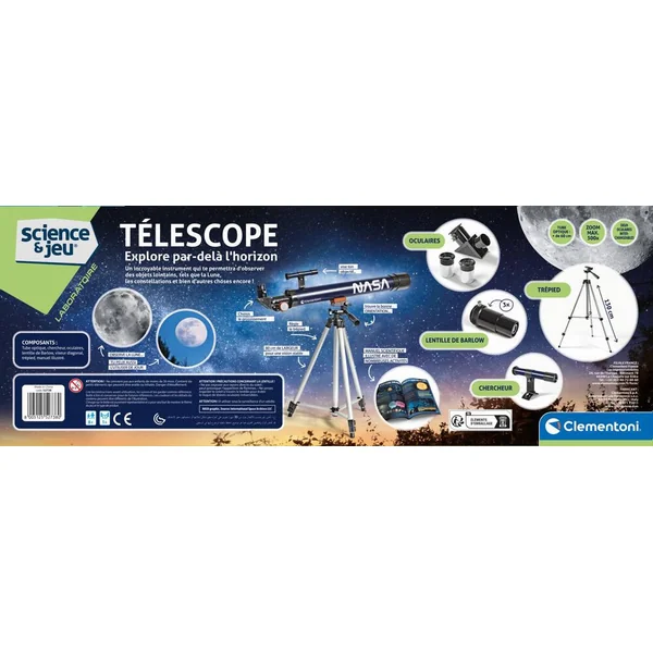 Découvrez le Télescope Nasa de Clementoni, un outil fascinant pour initier les jeunes explorateurs à l’astronomie. Conçu pour les enfants à partir de 8 ans, ce télescope éducatif permet d’observer la lune, les étoiles et bien plus encore.