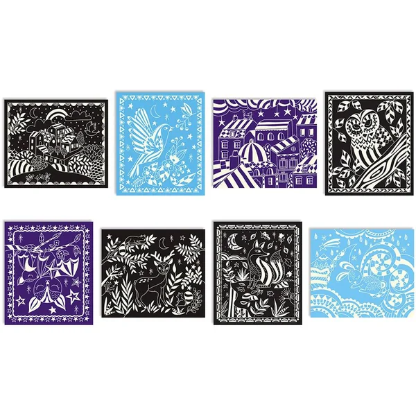 Initiez les enfants au scratch art avec le kit créatif Les ateliers du calme ! Avec 8 tableaux à gratter grâce à un outil en bois et 1 livret avec modèles et instructions.