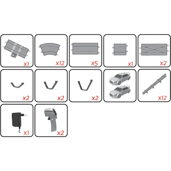 L’emballage contient des pièces de piste, un pont, 2x croisement, des glissières, 2x voitures de course, 2x manette et une source d’alimentation. Manuel en SK et guide en EN, ES, FR, PT, DE, NL, IT, RU.