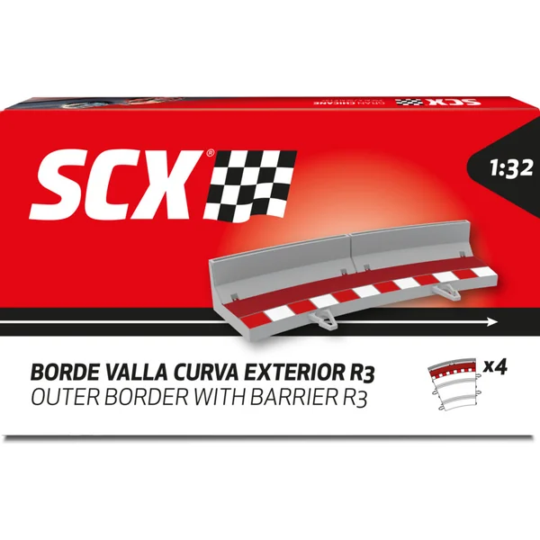 Éléments de bord avec des protections pour le circuit extérieur R3 des pistes de course SCX 1:32. L’emballage contient 4 pièces d’éléments de bord avec des protections.