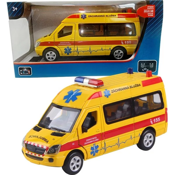 L’ambulance fonctionne sur un volant d’inertie et est équipée d’un gyrophare fonctionnel avec des feux d’alerte bleus et un son.