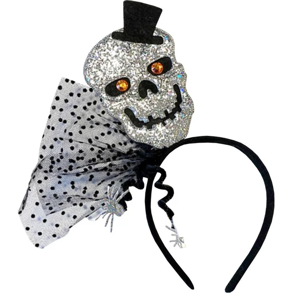 1 serre tête avec tulle, tête de mort pailletée et araignée.