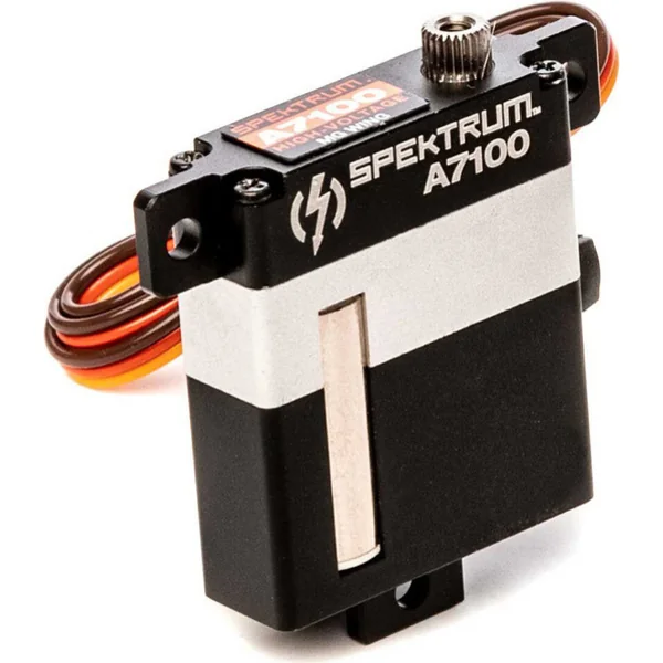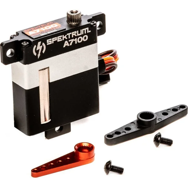 Le servo numérique spécial étroit Spektrum A7100 est idéal pour les profils fins des ailes d’avion, avec un couple de 8,3 kg.cm, une vitesse de 0,078 s/60° à une alimentation de 8,4 V. Poids de 28 g, dimensions de 10 mm x 30 mm x 35 mm. Roulements à billes et pignons en métal.
