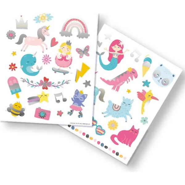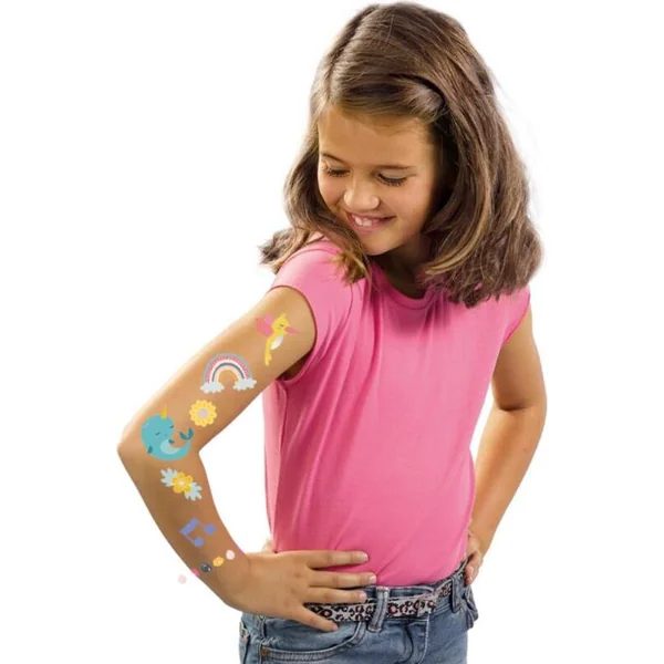 Messieurs, ce tatouage SES avec effet métallique illuminera immédiatement votre bras. Choisirez-vous la princesse sur skateboard ou la licorne ? Ce set contient 40 personnages amusants et joyeux. Le tatouage s’applique et se lave facilement.