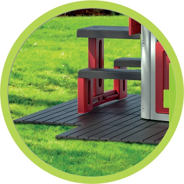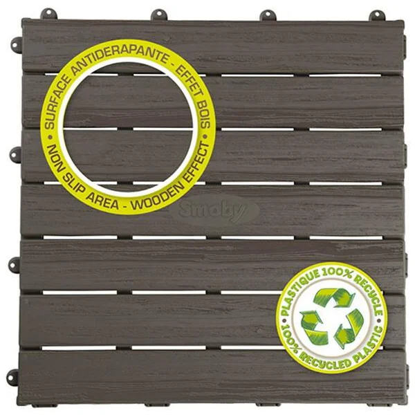 C’est un kit de dalles pour maison Smoby fait en matériau plastique recyclé ayant subi un traitement anti-UV et recyclable avec effet texturé bois. Ce set antidérapant évite à votre enfant de faire des chutes graves. Le kit est également très facile à fixer grâce à son système de clipsage intelligent et rapide.