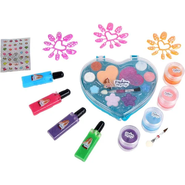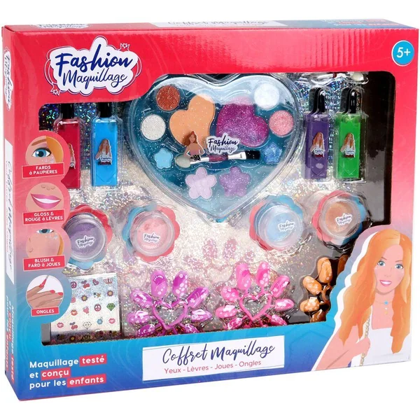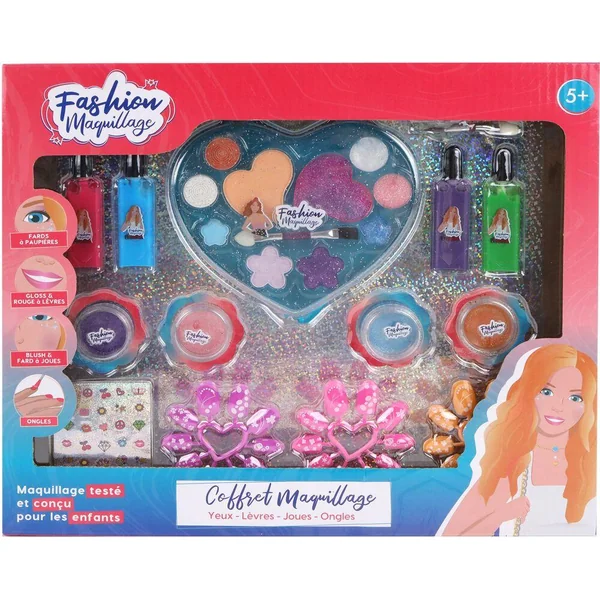 1 boite comprenant des fards à paupières et des blushs, 4 vernis à ongles, 4 gloss, des faux ongles et des steakers.