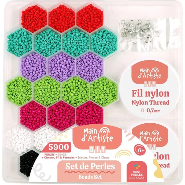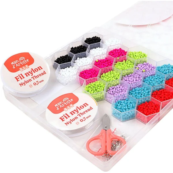 Set de perles 24 cases avec fil et ciseaux.