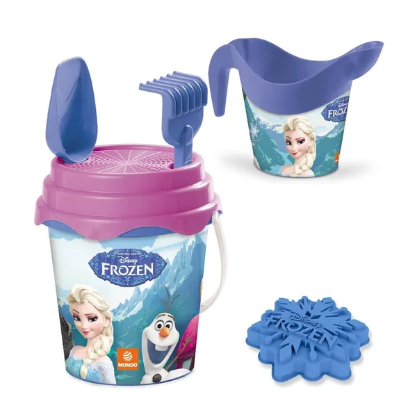 Idéal pour s’amuser à la plage. Seau La Reine Des Neiges de 17 cm de diamètre, garni avec une pelle, un râteau, un moule, un tamis et un arrosoir.