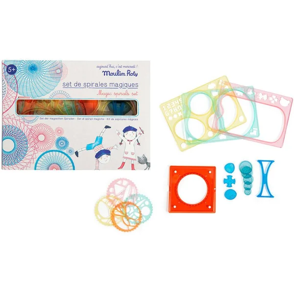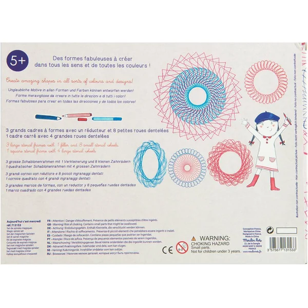 Un set complet de grands cadres et petites roues dentelées pour créer des formes fabuleuses dans tous les sens, et de toutes les couleurs ! A utiliser avec des crayons feutres ou crayons de couleur.
