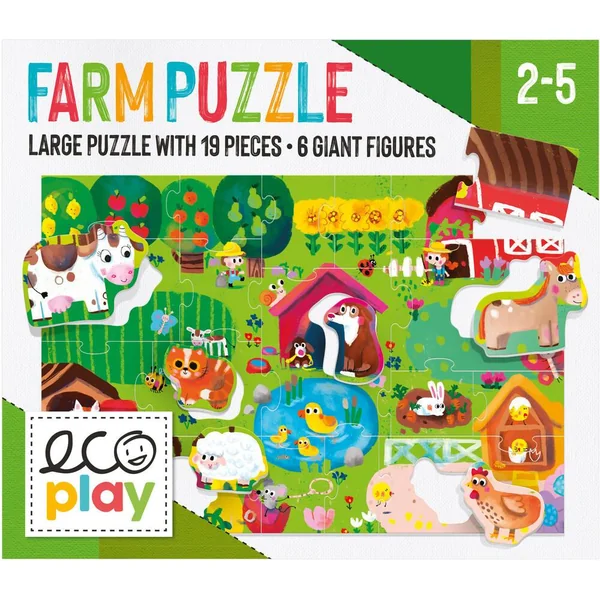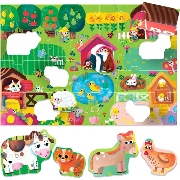 Puzzle de ferme avec 19 pièces et 6 grandes silhouettes d’animaux. Composez le grand puzzle de la ferme et amusez-vous à insérer les animaux dans les espaces correspondants.