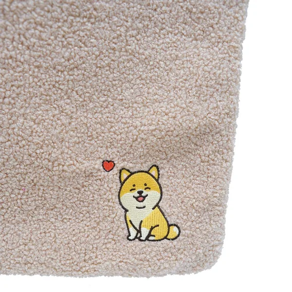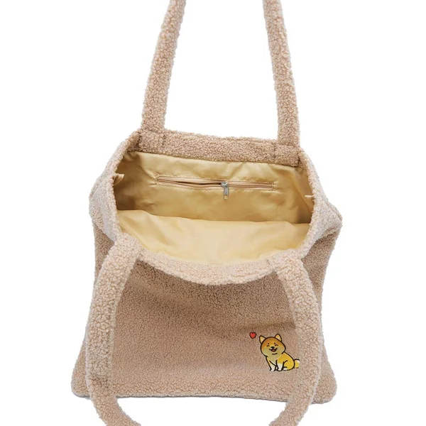 Sac au format shopping bag en matière teddy douce et tendance beige, avec un Shiba Inu, représenté dans le coin du sac.