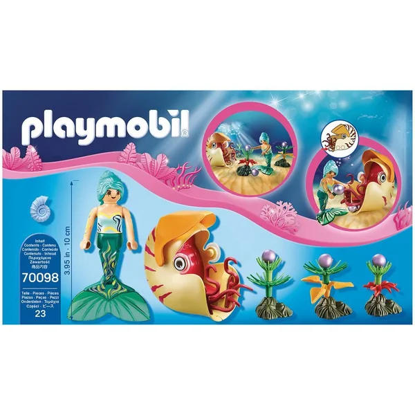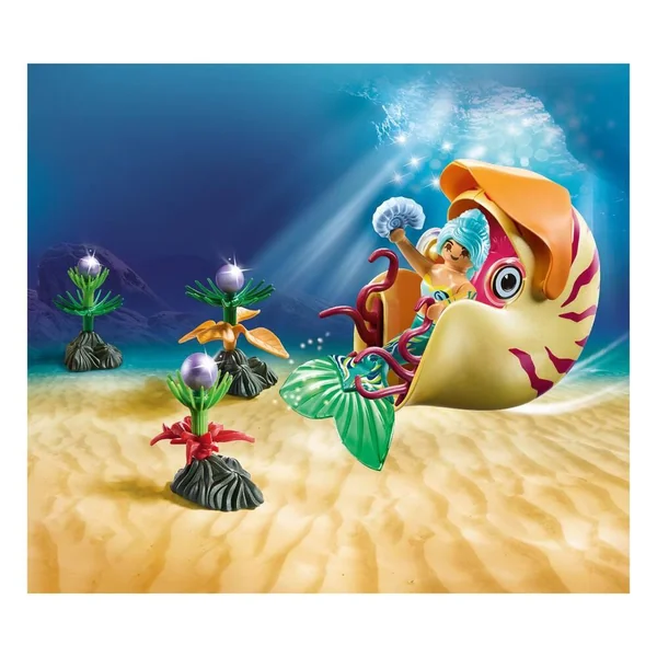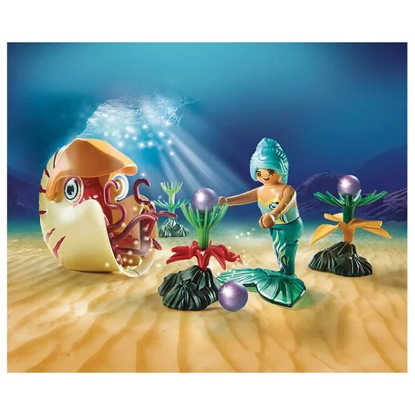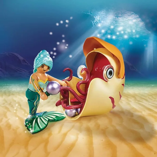 La sirène et l’escargot de mer partent ensemble à la recherche des perles les plus précieuses. La sirène peut se loger dans la coquille de l’escargot qui l’escorte dans les profondeurs de la mer.