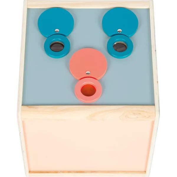 La loupe, la lentille facettée et la lentille rouge permettent une nouvelle perspective sur les objets à explorer à l’intérieur de la boîte. Les trois lentilles en bois peuvent être facilement retirées. Les ouvertures sur le dessus peuvent ensuite être utilisées pour regarder, sentir et écouter. L’angle d’ouverture des portes arrière et des volets supérieurs permet de réguler la quantité de lumière qui pénètre dans la boîte.