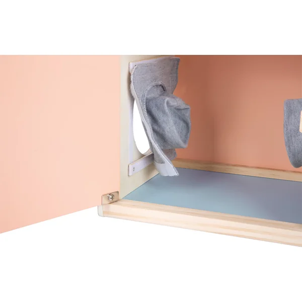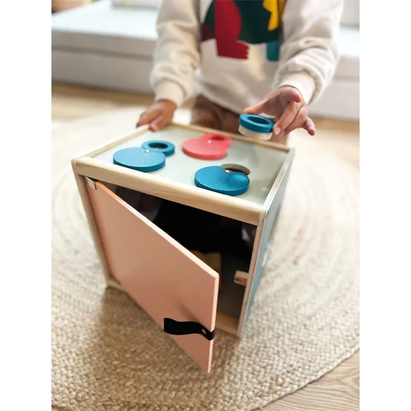 La boîte en bois peut être remplie de divers objets par les portes arrière avec un verrou magnétique. Les housses en tissu sur les ouvertures latérales cachent la vue à l’intérieur de la boîte tout en assurant un accès agréablement doux. Elles sont de taille adaptée aux enfants comme aux adultes.