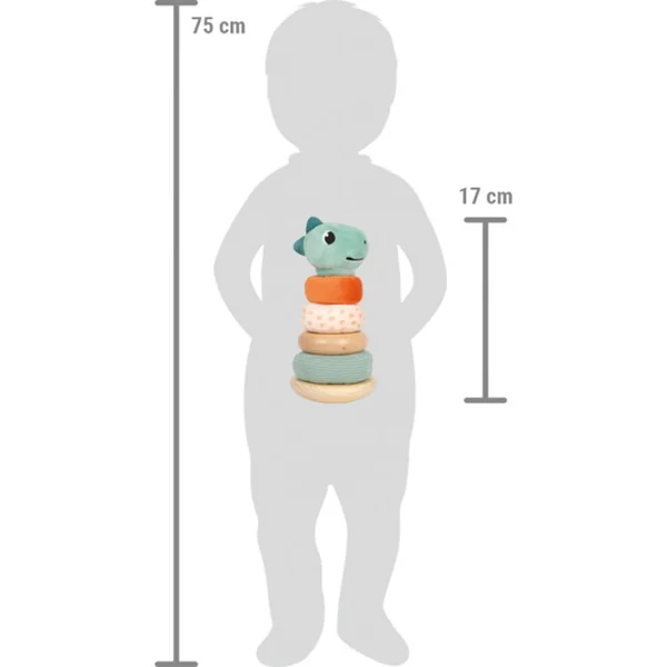 La base de la tour est arrondie, 3 anneaux sont fabriqués à partir de tissus de différents motifs, couleurs et textures, et 1 anneau est en bois. Le thème de la gamme de produits « Dino » est constitué de fascinantes créatures préhistoriques qui attirent l’attention des personnes de tous âges.