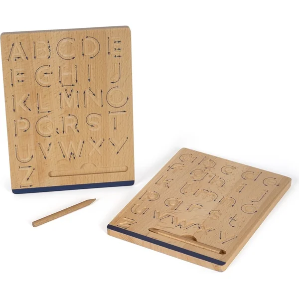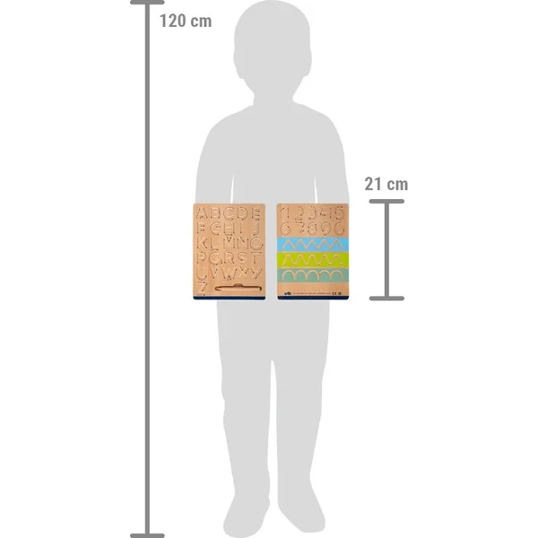 Sur deux planches en bois double face, vous trouverez des modèles avec des rainures de différentes formes, chiffres et lettres. Avec le crayon sans mine fourni, l’enfant suit les rainures, dans la direction indiquée par les flèches, et apprend ainsi à écrire correctement un chiffre ou une lettre.