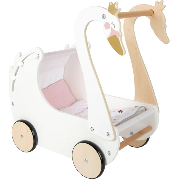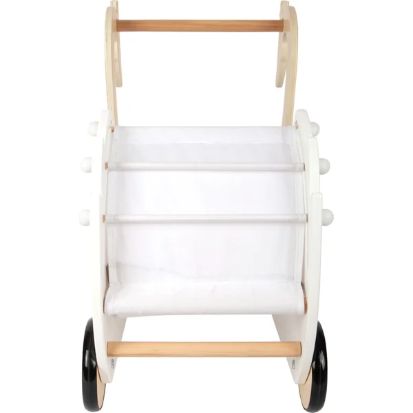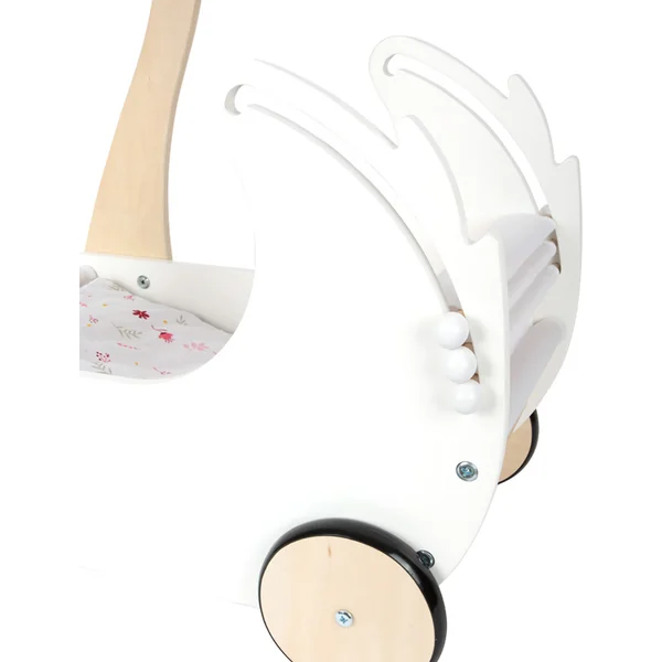 Caractéristiques principales : poussette incluant la literie pour poupées jusqu’à 46 cm de hauteur, auvent rétractable, marche silencieuse, construction en bois durable.