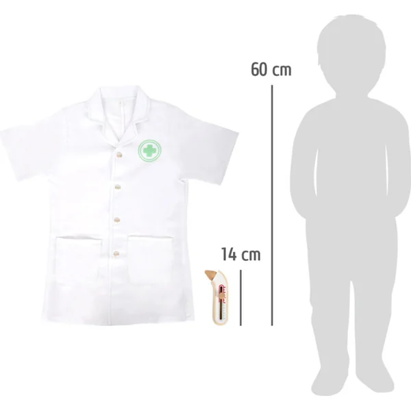 Le thermomètre a un indicateur de température réglable. La blouse de médecin a deux poches pratiques, se ferme avec des boutons-pression, ce qui permet aux jeunes médecins de l’enfiler et de l’enlever rapidement. Un jouet idéal pour le jeu de rôle ou comme costume pour le carnaval. Un accessoire parfait pour une mallette de médecin et d’autres produits similaires.
