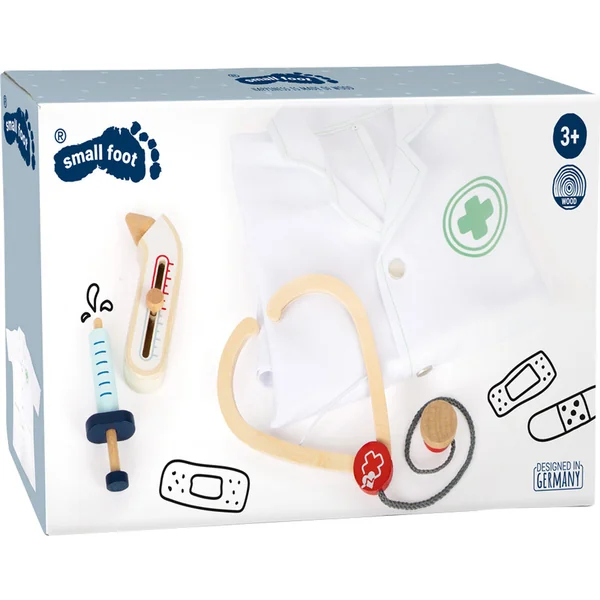 Ensemble de jeu complet avec une blouse de médecin et du matériel médical. Vous y trouverez une seringue, un stéthoscope et un thermomètre en bois robuste. Le piston de la seringue se rétracte lorsqu’il est pressé.