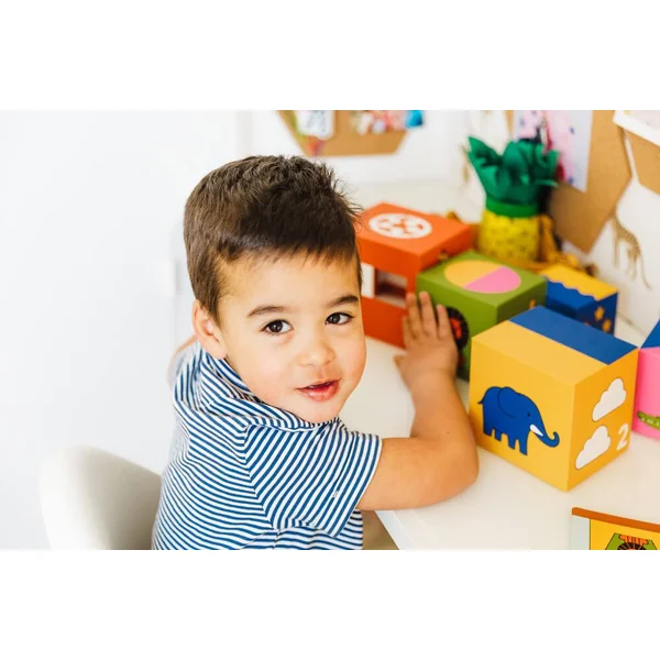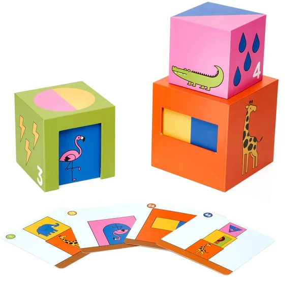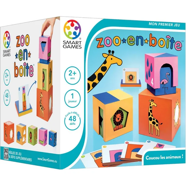 Découvrez le jeu Zoo en boîte de SmartGames, un premier jeu de logique et de réflexion pour les enfants avec 48 défis. Jouons à cache-cache avec les animaux du zoo. Le jeu contient cinq boîtes en carton renforcé de différentes tailles, un chevalet en carton, 48 cartes défis recto-verso et un dépliant pour les solutions.