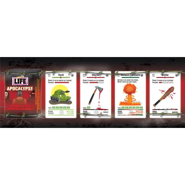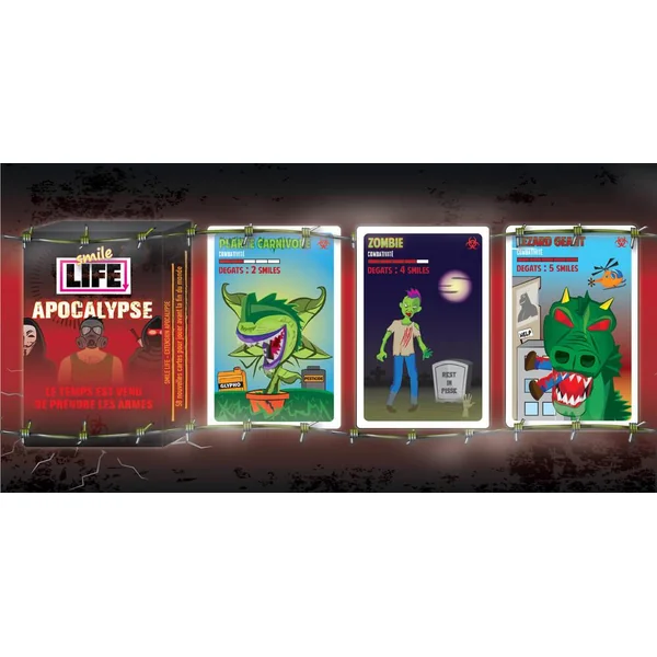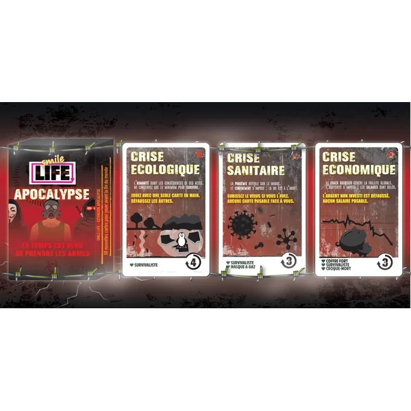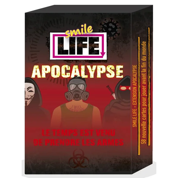 La fin est proche. Résistez aux crises. Armez-vous. Combattez. Affrontez vos adversaires. L’heure de l’Apocalypse a sonné. Smile Life Apocalypse offre de nombreuses nouveautés pour encore plus d’interactions, de surprises… et de fun ! Les nouvelles mécaniques apportent une multitude de possibilités encore inexplorées dans le jeu. Toujours en restant très accessible, avec humour, clins d’oeil à la pop culture et second degré. Nécessite le jeu de base Smile Life