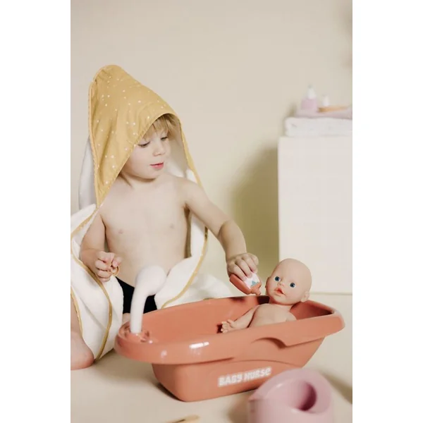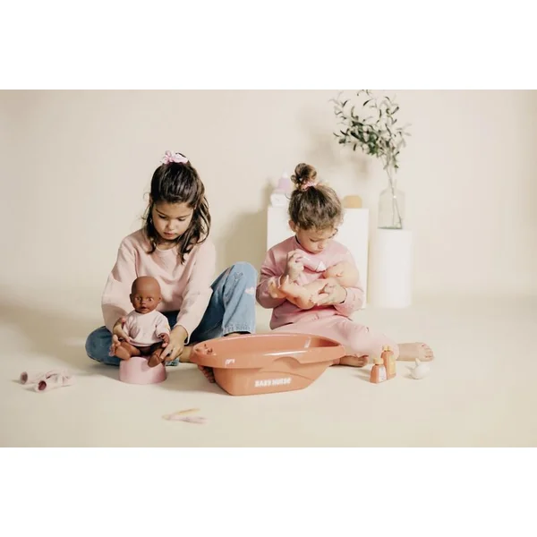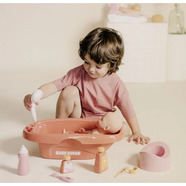 La baignoire pour poupées Baby Nurse avec douche amovible a une fonction rotative mécanique qui facilite le lavage des cheveux de la poupée.