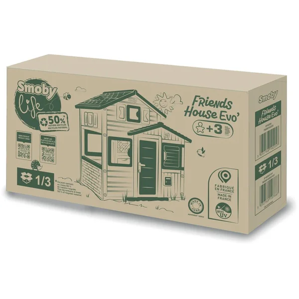 Maison moderne et spacieuse grâce à ses larges dimensions dont sa hauteur d’1m60. Ses couleurs actuelles et harmonieuses sauront facilement prendre place dans les jardins ou terrasses. Elle est équipée d’une porte avec judas, un portillon à l’arrière de la maison servant de « passage secret », de 6 fenêtres, de 2 volets pivotants à 360° et d’une boite aux lettres fonctionnelle. Structure stable et résistante en plastique soufflé, murs latéraux et toits injectés. Les pièces plastiques sont traitées anti-UV pour une bonne résistance et une meilleure tenue des couleurs dans le temps. Cette maison a été conçue pour pouvoir accueillir tous les accessoires Smoby tels que la cuisine d’été, la table pique-nique, le récupérateur d’eau, la lampe nomade rechargeable, ou encore la sonnette. Ce jouet contient au moins 50% de matière recyclée. Dimensions optimisées pour faciliter le transport – Maison livrée en 3 colis – Facile à monter. COLIS 1 /81020510 – EAN : 3032160107883 – Dimensions : 56 x24 x110.5 cm – Poids : 12kg – COLIS 2 7/810205102 – EAN : 3032160107890 – Dimensions : 55.2 x 23.4 x113.2 cm – Poids : 11kg – COLIS 3 7/810205103 – EAN : 3032160107906 – Dimensions : 56.4 x 26.4 x 122.7 cm – Poids : 15kg – Poids du produit monté : 34kg.