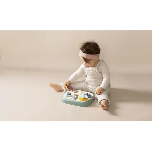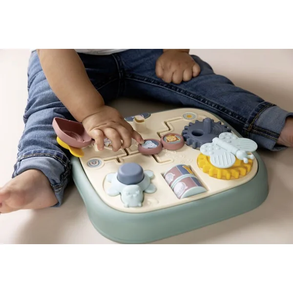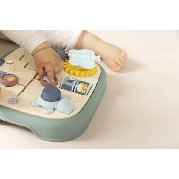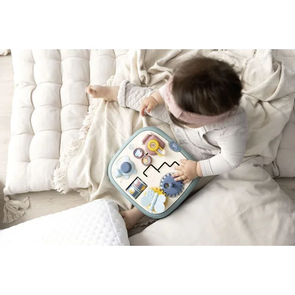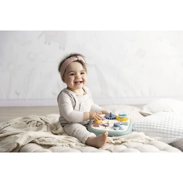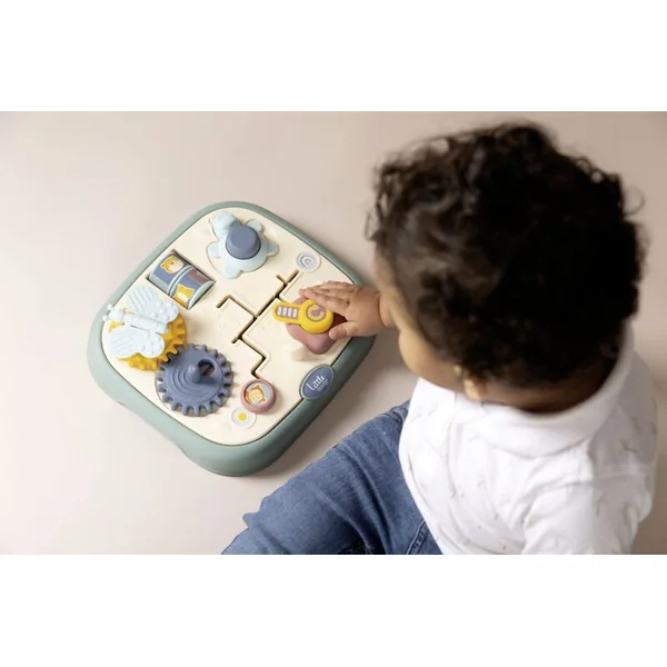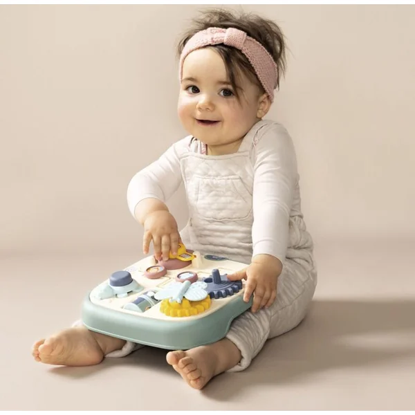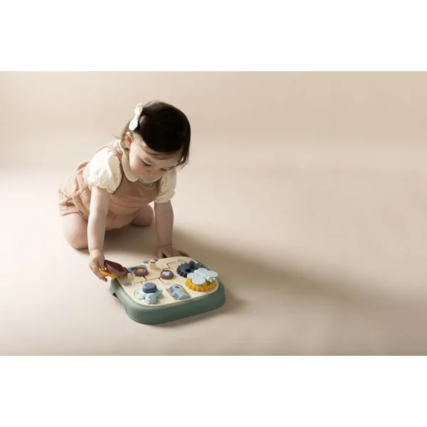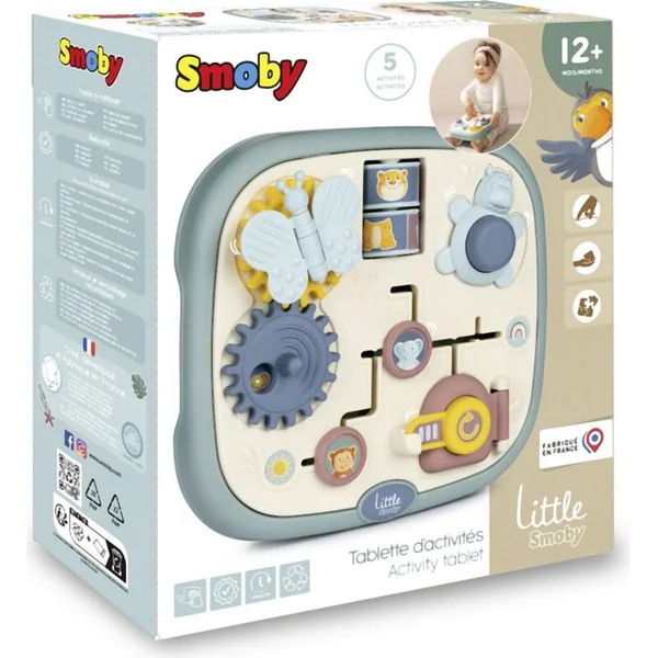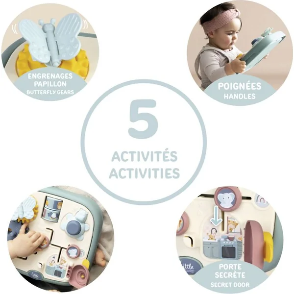 Tableau moteur Little Smoby avec 5 activités différentes et originales : labyrinthe, porte avec serrure, roues dentées, rouleaux et bouton.