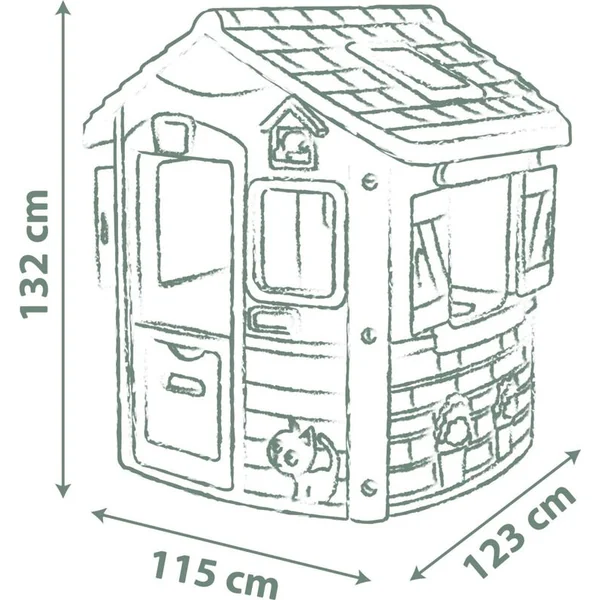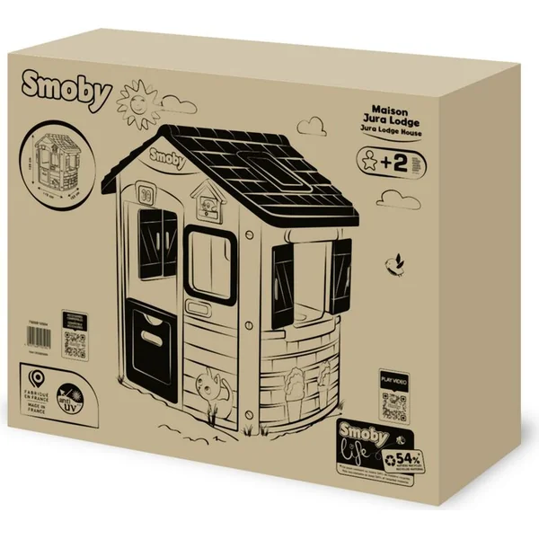 Maison stable et spacieuse Smoby Life Jura Lodge. Avec deux portes d’entrée (avant/arrière), 2 fenêtres avec volets et un mangeoire pour oiseaux.