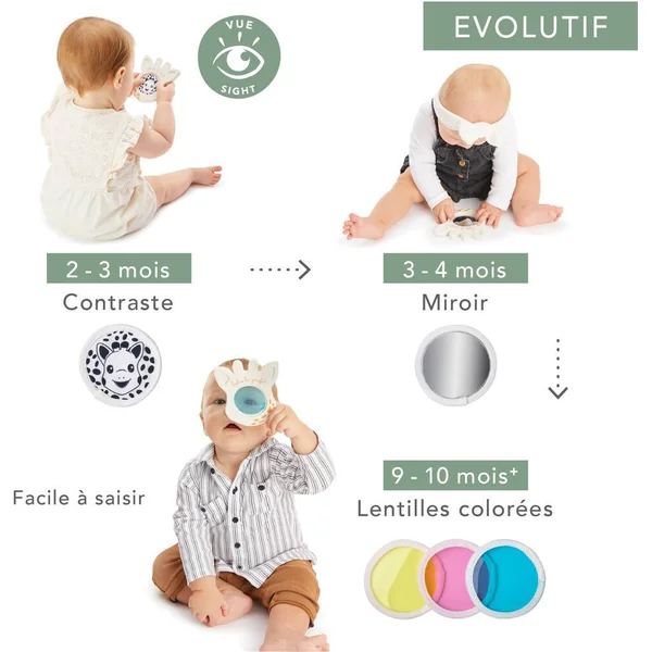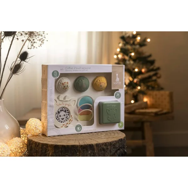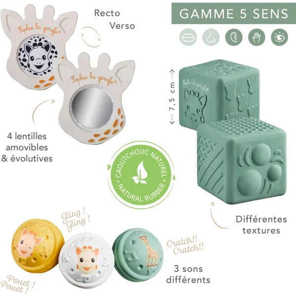 Un coffret complet pour éveiller les sens de bébé. Contient : Cube au textures, Miroir magique et 3 Balles muscials Sophie la Girafe.