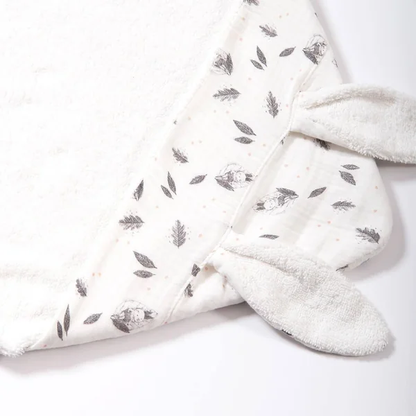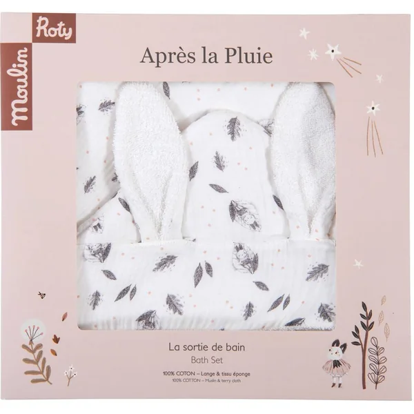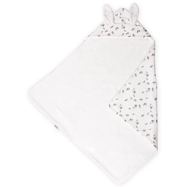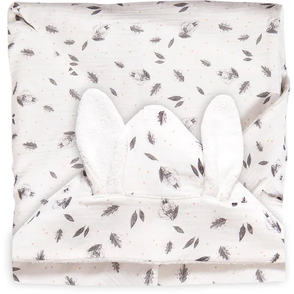 Cape de sortie de bain 100% coton en matière éponge bouclette et lange à motifs. La capuche est surmontée de deux adorables oreilles de lapin. Elle peut être brodée au prénom de l’enfant, idéal pour un cadeau naissance !